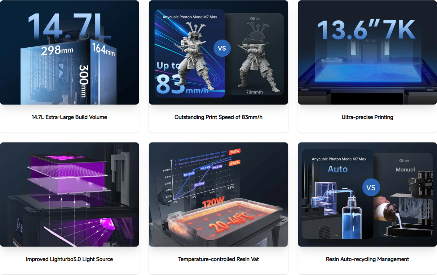 Klar for å ta 3D-printingen til neste nivå? Anycubic Photon Mono M7 Max kombinerer innovasjon, ytelse og brukervennlighet for å realisere selv de mest ambisiøse prosjektene dine.