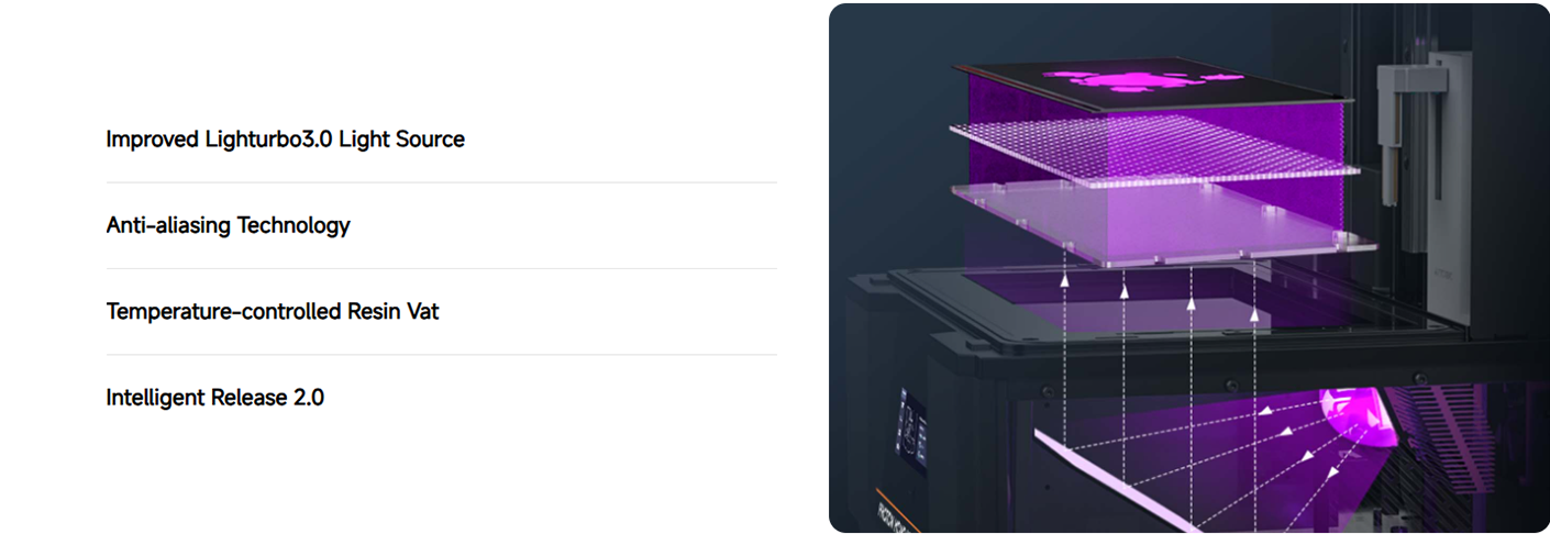 Takket være LightTurbo 3.0 High-Precision Light Source System leverer M7 Max rask og stabil printing med imponerende detaljnivå. Med anti-aliasing og 7K-oppløsning (46 μm XY-presisjon) får du jevne overflater og minimale laglinjer selv i de mest intrikate designene.