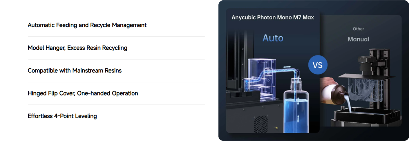 Det innebygde Resin Auto-Recycling Management System tar seg av materialflyten. Sensorer og luftpumpe overvåker resin-nivået, fyller på automatisk og hindrer avbrudd. Jevn oppvarming (20–40 °C) sikrer optimale resultater og holder resinen i perfekt tilstand.