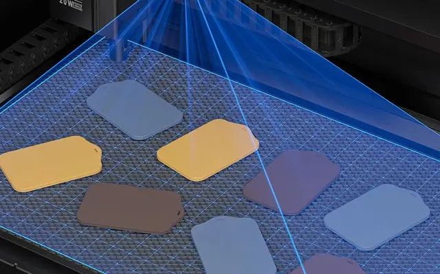 Autofokus sørger for korrekt laserhøyde med ett trykk, mens AI-basert programvare effektiviserer batch-gravering ved automatisk plassering av design på emnene. Skulle strømmen bli borte, fortsetter maskinen automatisk fra siste posisjon når strømmen er tilbake.