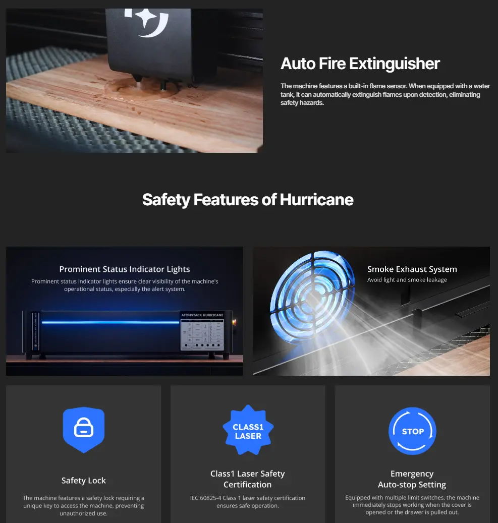Atomstack Hurricane er en perfekt maskin både for hobby og makerbruk, men er også godt egnet på skoler og andre instanser med Klasse 1 Sikkerhetssertifisering, flammesensor, nødstopp, tildeteksjon, åpne-lokk deteksjon og tilogmed automatisk flammeslukking med vann dersom du kopler til vanntank!
