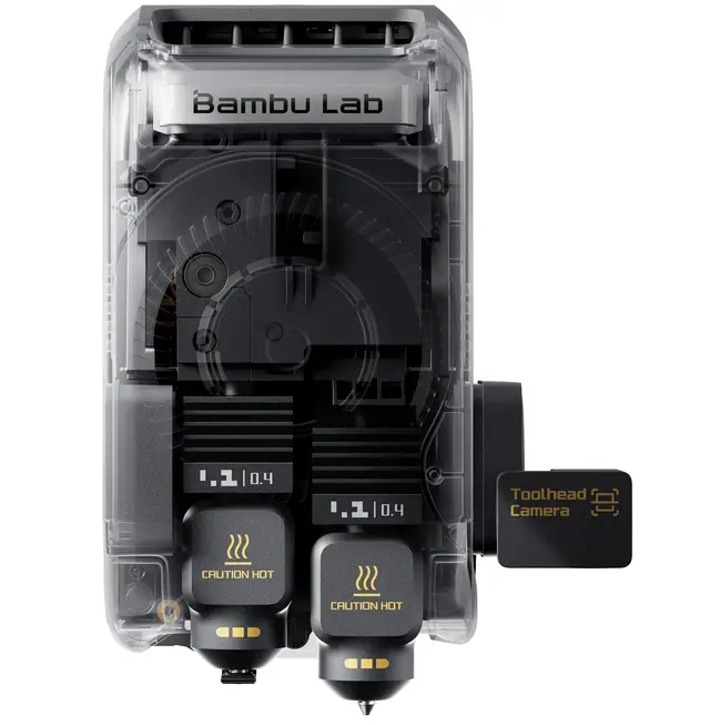 X2D er bygget rundt et ekte dual-nozzle system med to forskjellige ekstruderløsninger. Hoveddysen bruker direct drive og er optimalisert for modellmaterialer, mens den sekundære dysen bruker Bowden-oppsett og er utviklet for supportmaterialer (men kan også printe med andre materialer).