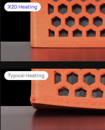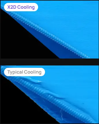 Printeren har et smart temperatursystem med to moduser. I Cool Mode optimaliseres luftutskifting for materialer som PLA, mens Heat Mode aktivt varmer kammeret opp til 65°C for mer krevende materialer som ABS, ASA og Nylon. Sammen med 300°C nozzle gir dette X2D et langt bredere bruksområde enn vanlige forbrukerprintere.