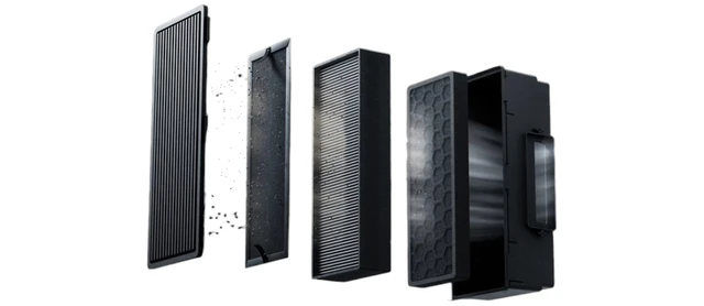 G3 pre-filter + H12 HEPA + aktivt kull |