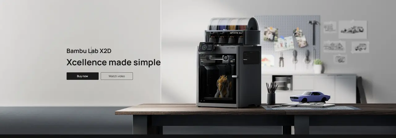 Selv om X2D kan printe med to uavhengige filamenter, er arkitekturen primært optimalisert for modell + support. Dette er også den anbefalte arbeidsflyten. I praksis betyr det raskere support-printing, renere overganger og mindre kompromisser enn på tradisjonelle single-nozzle printere med AMS-baserte materialbytter.
