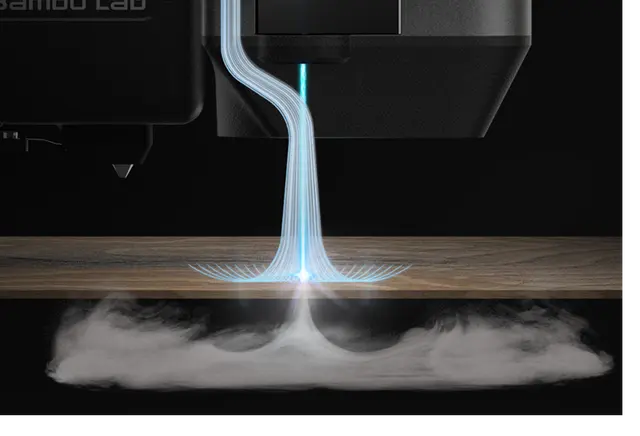 H2D er utstyrt med et effektivt avtrekkssystem som fjerner røyk og støv fra laseroperasjoner, noe som reduserer forurensning betraktelig. Under utviklingen ble det gjennomført omfattende tester som viser at med regelmessig rengjøring er påvirkningen på presisjon og ytelse minimal. For detaljerte rengjøringsinstrukser, se Bambu Lab Wiki.