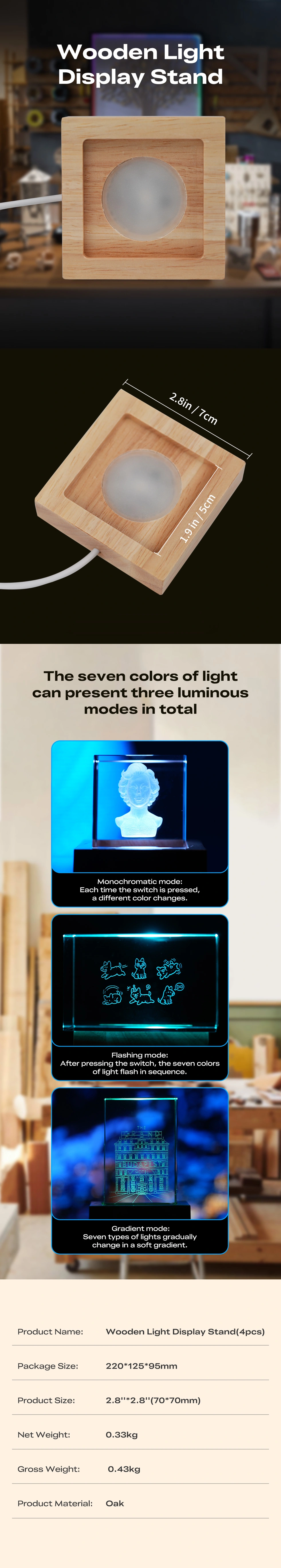 Løft dine krystall-gravyrer til et nytt nivå. Wooden Light Display Stand er den perfekte LED-basen for å vise frem 3D laser-graverte krystaller. Med innebygd LED-belysning i syv farger transformeres krystallen fra et vakkert objekt til et spektakulært lysshow. Eik-finishen gir en varm, naturlig estetikk som passer perfekt i både hjemmet og på kontoret.