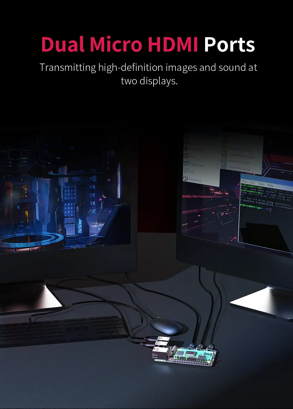 Dual HDMI utganger, 4 USB utganger,CSI/DSI og MicroSD