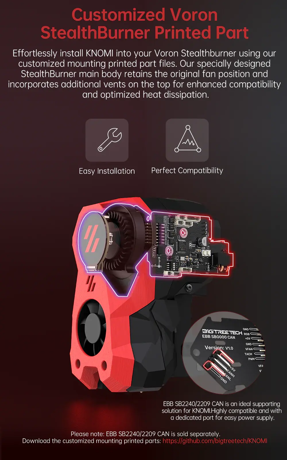- Kompatibel med Voron StealthBurner ved bruk av våre egendefinerte utskriftsfiler.