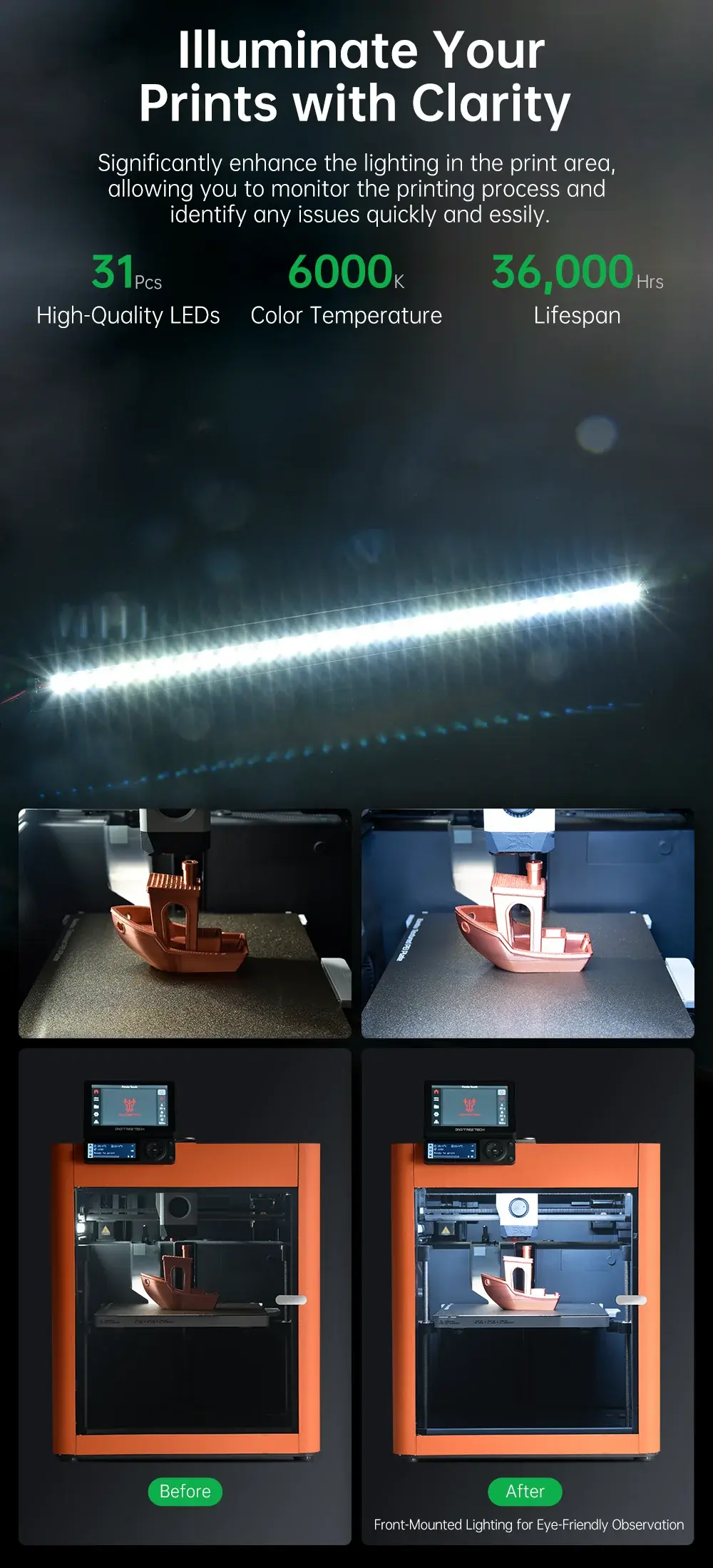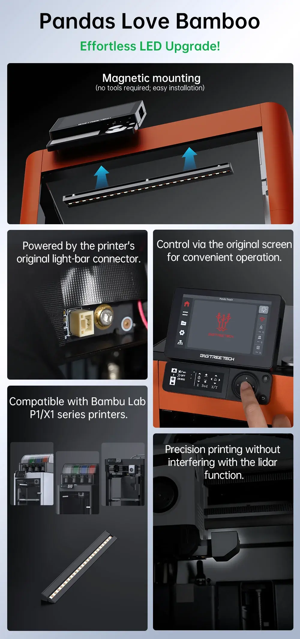 Oppgrader lyset i din Bambu Lab skriver!Denne ledstripen passer til P1 & X1 serie og er svært enkel å montere takket være magnetisk innstallasjon og kompabilitet med den originale lysbjelkens kontakt
