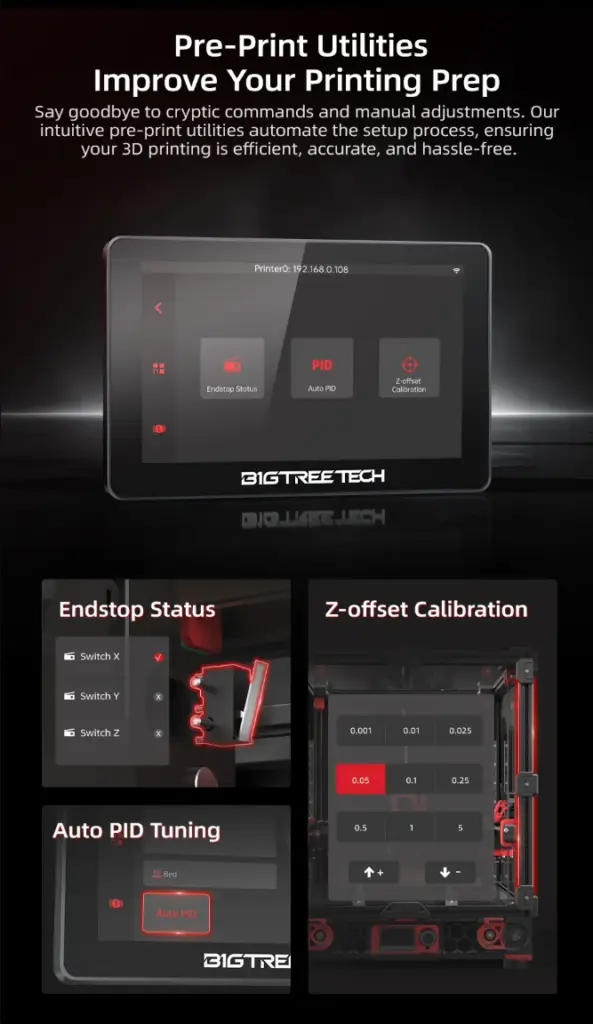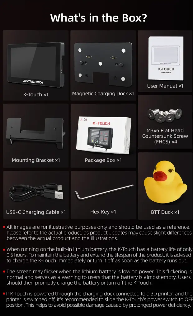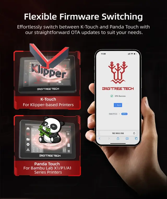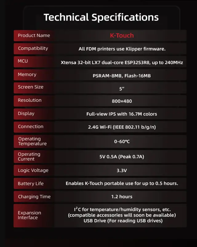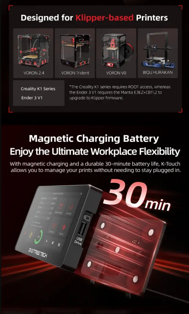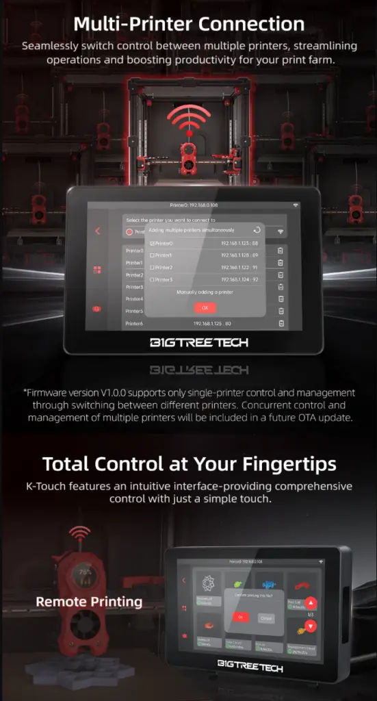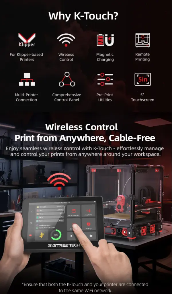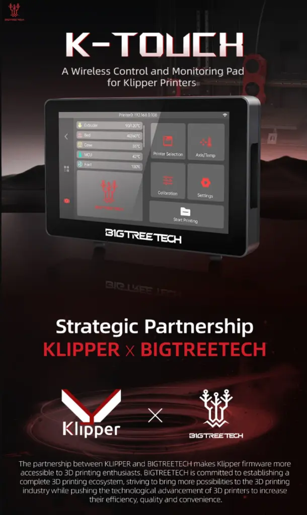 BIGTREETECH K-Touch V1.0 er en dedikert touchskjerm for Klipper-printerentusiaster som ønsker en mobil, trådløs løsning. Skjermen kommuniserer via 2.4?GHz Wi-Fi med Klipper/Moonraker, og lar deg fjernstyre varme, kalibrering og printjobber uten PC-tilkobling .