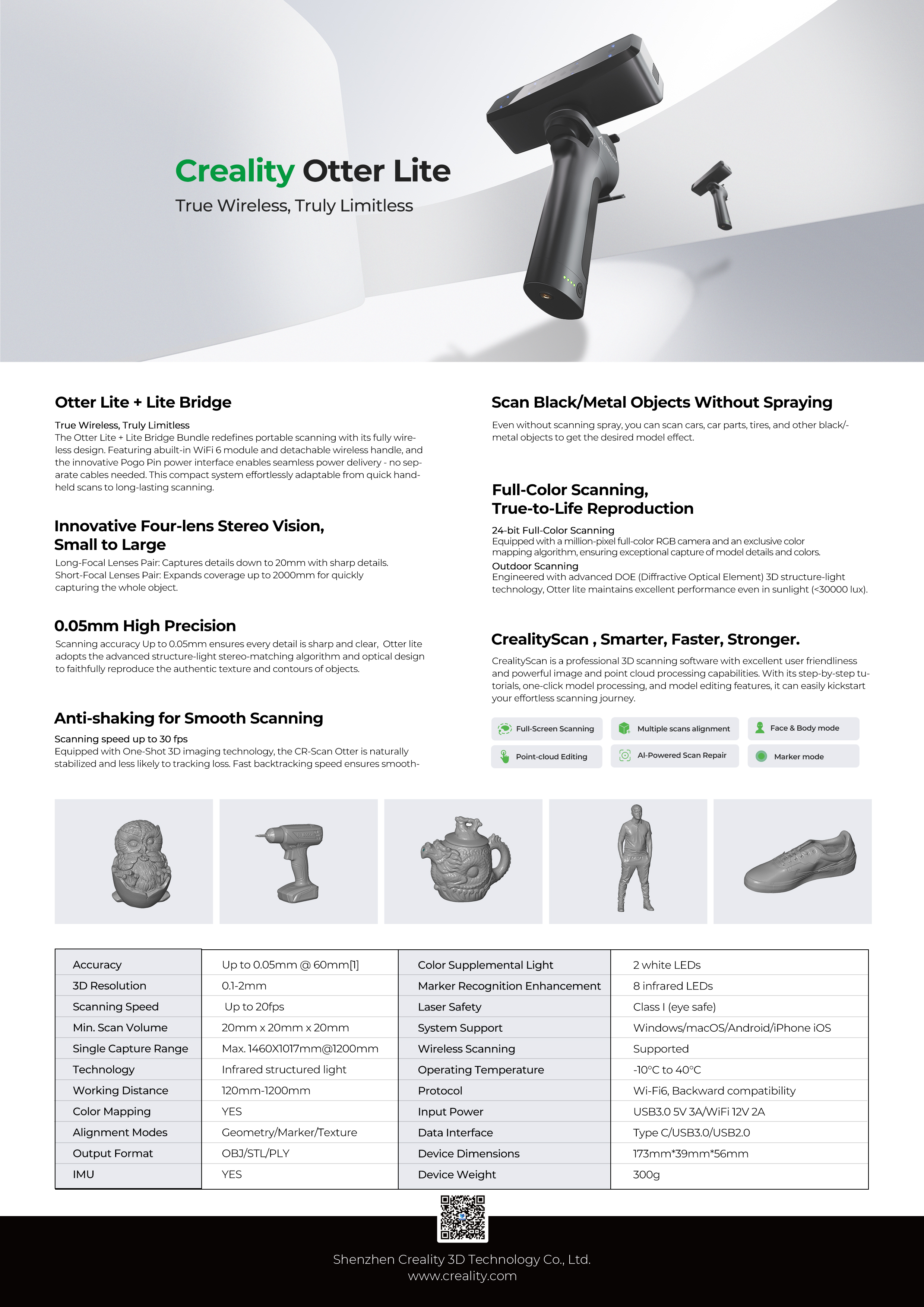 Creality Otter Lite kombinerer et lett og bærbart design med et avansert flerkamera-oppsett for stabil, nøyaktig innsamling av geometri og tekstur.