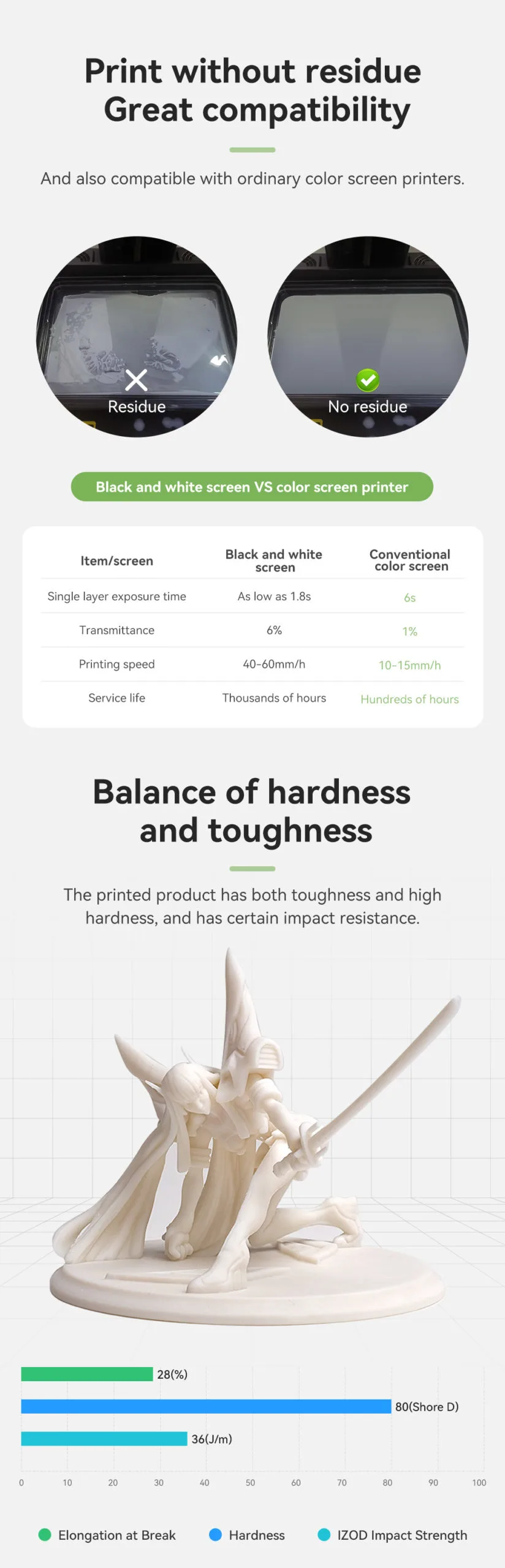 eResin PLA er en plantebasert resin med fordeler som at den lukter mindre, er svært lett å skrive med, og er mer trygg å håndtere enn vanlig resin.Resinet gir en pen overflate som har god resistanse mot riping, utskriften warper/krymper lite, og er ikke veldig sprø og gir derfor modeller som tåler noe håndtering.