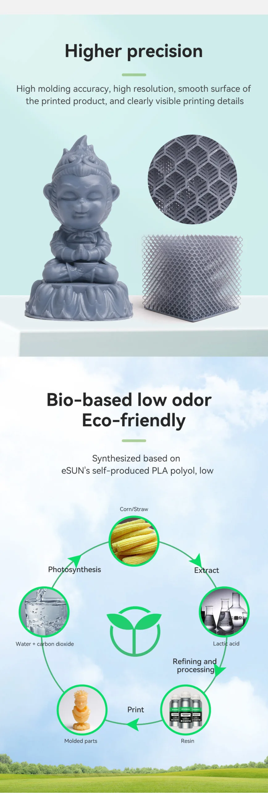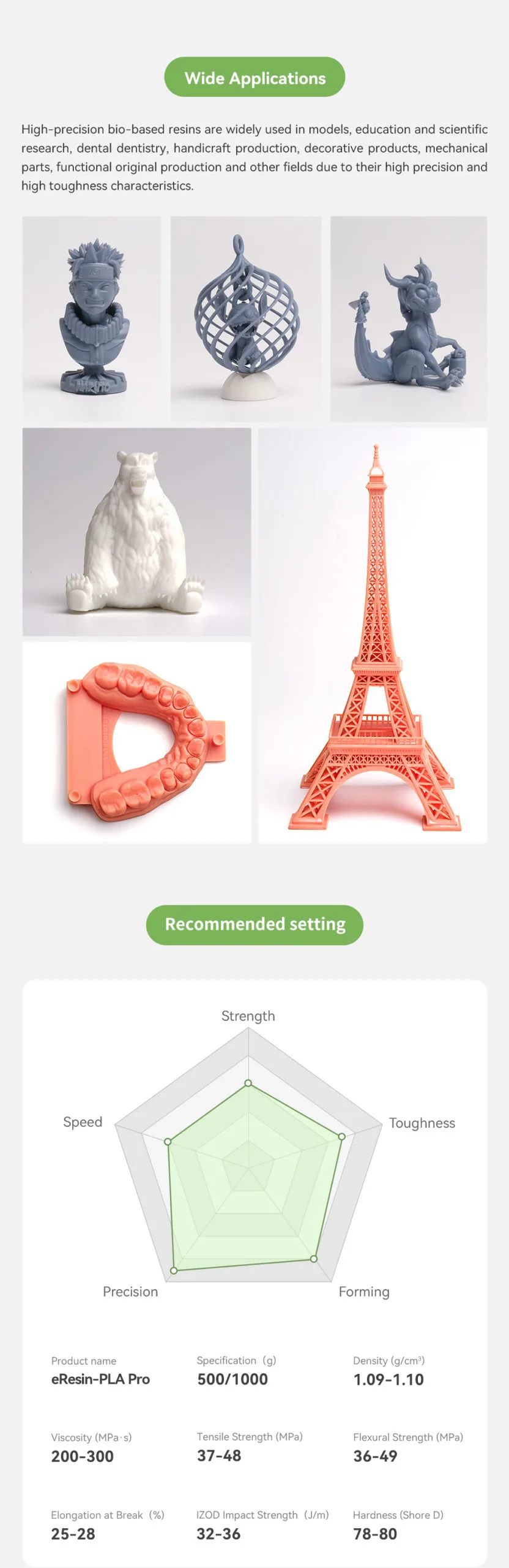 eResin-PLA Pro er et økovennlig resin, som gir høy oppløsning og fine overflater på utskriften. Dette resinet er versatilt og kan brukes til alt fra figurer til dentale modeller.