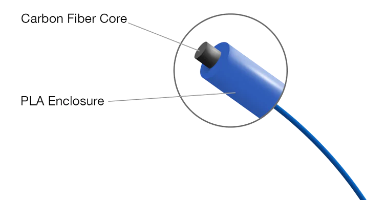 Den helt nye PLA PRO Carbonfiber har i motsetning til standard karbonfibertilsatt filament ikke innblandet fibre i selve PLA-materialet, men kommer i stedet med en kjerne av karbonfiber innkapslet av PLA.