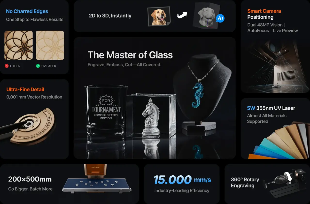 En av de mest avanserte egenskapene ved xTool F2 Ultra UV er muligheten for intern gravering (inner engraving) i glass. Her skapes graveringen inne i selve glassmaterialet, uten å påvirke overflaten. Dette åpner for spektakulære visuelle effekter, 3D-mønstre og eksklusive design i krystall og glass.